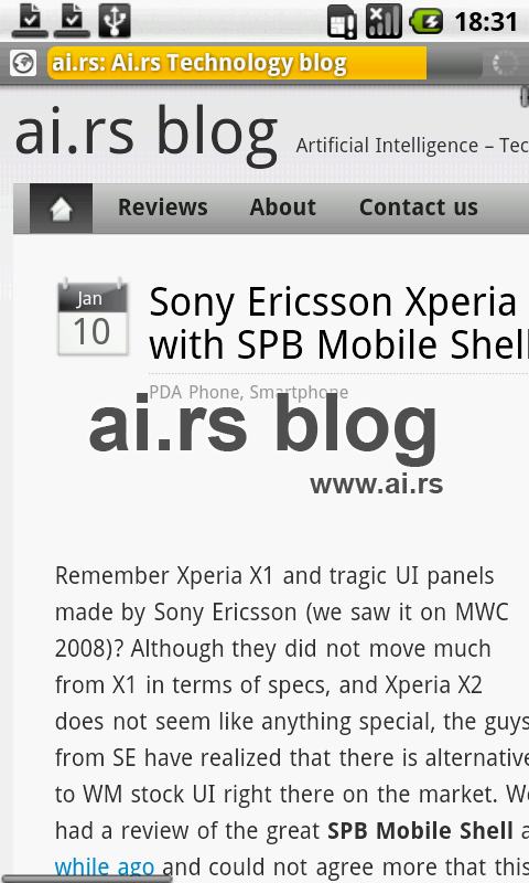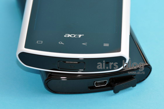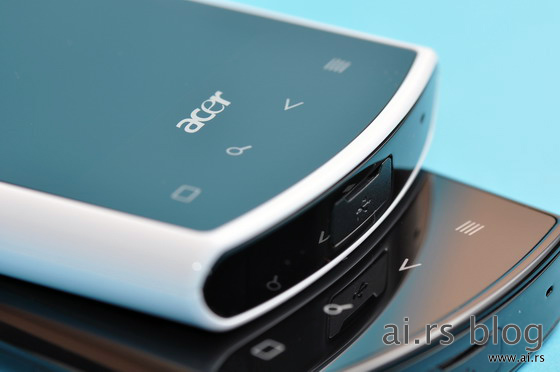 When we first saw Acer Liquid, we were simply amazed by its good looks. Black plastic case merges with the screen and navigation buttons to form one smooth, almost monolithic structure. When screen is off and ambient light is low, you can’t visually separate screen from casing. Dazzling. There are only four buttons on the sides (power, camera, volume up and down), 3.5mm audio jack, and mini USB connector covered by plastic plug. This is one really good looking device. And then we have taken it in our hand and a small part of that good first impression vanished. It felt “plasticky” when touched, a little bit cheap for device of this price range. Then we turned it on, and played a little bit, and all we can say is that it is seriously fast and responsive.