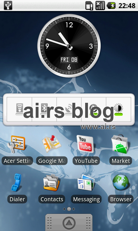 Currently, Acer Liquid comes with version 1.6 of Android operating system. There are plans by Acer to bring version 2.0 by the end of the March of current year, but we’ll see what will come out of that. Good news is that current OS runs like mad on Snapdragon processor. All your commands are interpreted almost immediately; running multiple programs simultaneously is a breeze; and when one of the programs crashes, device continues to run smoothly. There are only three virtual desktops on Acer’s build of current version of OS. If you are used to more, you’ll notice that. If you are not, it will not bother you.